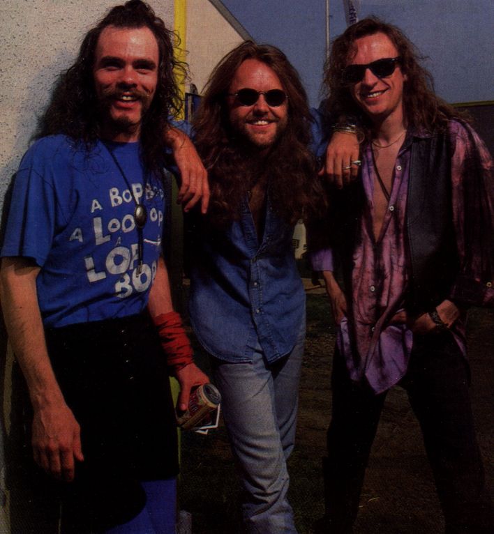 1993年、ミルトンキーンズ・フェスのバックステージにて。左からショーン・ハリス、ラーズ・ウルリッヒ、ブライアン・タトラー